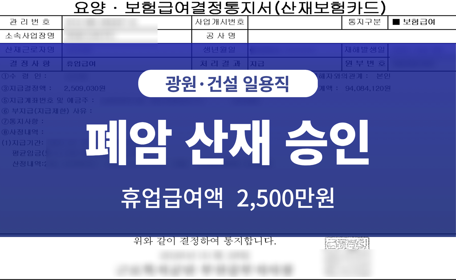 폐암발병 잠복기 또한 충족하여 재해자의 폐암과 직업력 간의 상당한 인과관계가 인정되어 승인되었습니다.